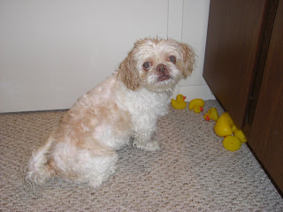 That's right...she bought rubber ducky doggie toys and put them in the bath water! There's a momma ducky and four baby duckies. She thought she would trick me into getting into the tub by putting toys in there. That was NOT going to happen. I investigated the new toys from afar...outside of the bath water.