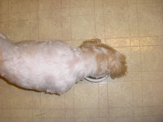 So, to try to get me to eat the kibbles, Mom puts pieces of canned food on top of the kibbles. She puts some powder stuff in there, too, for extra vitamins and stuff. Mom thinks she's soooo sneaky.